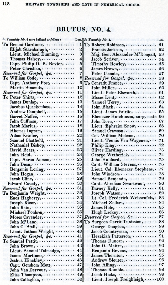 Page 118 of 'The Balloting Book' lists names of Revolutionary War Soldiers who were balloted to receive each bounty land lot within Township #4 - BRUTUS NY.
